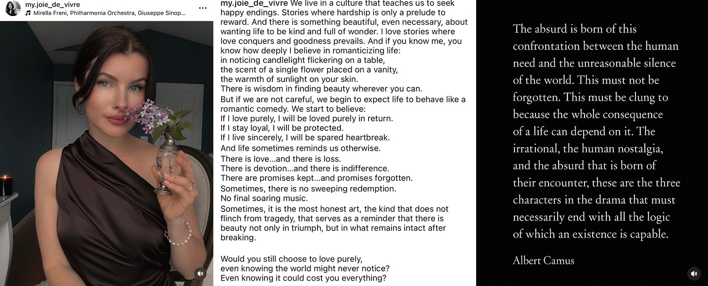 I understand that longing. I really do. Part of me still lives there. I still believe in romanticizing life. I still believe in candlelight flickering on the dinner table, in the scent of a single garden rose placed on my vanity, in sunlight warming my skin, in all the small ways I can make my life feel beautiful. I do believe there is great value in that, in refusing to become numb. There is value in creating a certain atmosphere, in noticing what is tender, in making room for wonder, for whimsy, for beauty.