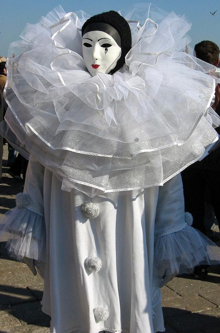 This is not a Venetian civic mask so much as an evolving theatrical archetype, emerging from the commedia tradition and becoming famous through Italian performers in Paris. He is often unmasked but white-faced, dressed in loose white clothing, and shaped into the figure we now recognize as the sad clown, tender, naïve, and exposed. Pierrot is the costume of longing, recognizable enough that people can tell what he is feeling before any word is spoken.